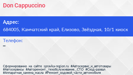 Don Cappuccino по адресу 684005, Камчатский край, Елизово, Звёздная, 10/1 киоск в дальнейшем Организация, размещена в следующих категориях: