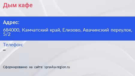 Дым, кафе по адресу 684000, Камчатский край, Елизово, Авачинский переулок, 5/2 в дальнейшем Организация, размещена в следующих категориях: