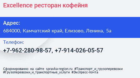 Excellence, ресторан-кофейня по адресу 684000, Камчатский край, Елизово, Ленина, 5а в дальнейшем Организация, размещена в следующих категориях: