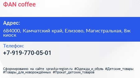 ФАN coffee по адресу 684000, Камчатский край, Елизово, Магистральная, 8ж киоск в дальнейшем Организация, размещена в следующих категориях: