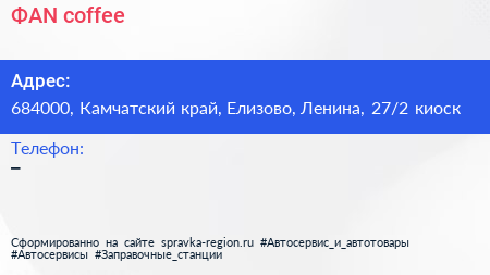 ФАN coffee по адресу 684000, Камчатский край, Елизово, Ленина, 27/2 киоск в дальнейшем Организация, размещена в следующих категориях: