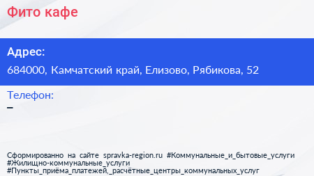 Фито, кафе по адресу 684000, Камчатский край, Елизово, Рябикова, 52 в дальнейшем Организация, размещена в следующих категориях: