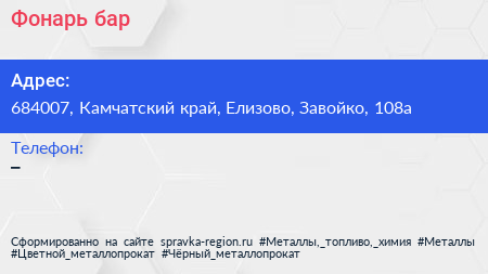 Фонарь, бар по адресу 684007, Камчатский край, Елизово, Завойко, 108а в дальнейшем Организация, размещена в следующих категориях: