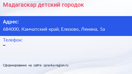 Мадагаскар, детский городок по адресу 684000, Камчатский край, Елизово, Ленина, 5а в дальнейшем Организация, размещена в следующих категориях: