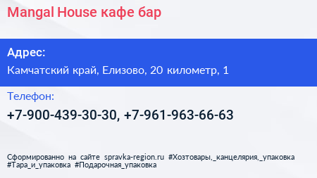 Mangal House, кафе-бар по адресу Камчатский край, Елизово, 20 километр, 1 в дальнейшем Организация, размещена в следующих категориях: