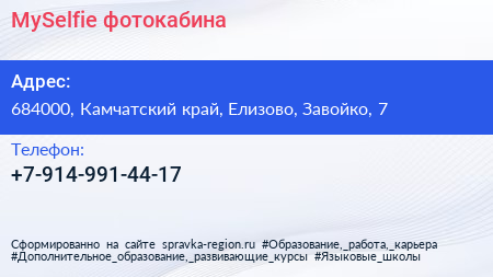 #MySelfie, фотокабина по адресу 684000, Камчатский край, Елизово, Завойко, 7 в дальнейшем Организация, размещена в следующих категориях: