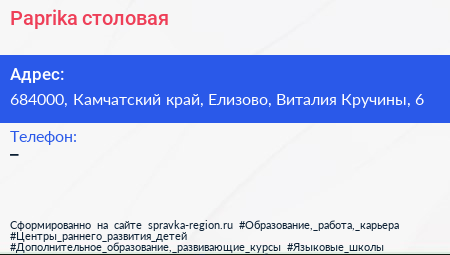 Paprika, столовая по адресу 684000, Камчатский край, Елизово, Виталия Кручины, 6 в дальнейшем Организация, размещена в следующих категориях: