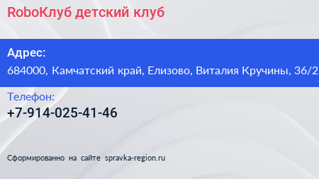 RoboКлуб, детский клуб по адресу 684000, Камчатский край, Елизово, Виталия Кручины, 36/2 в дальнейшем Организация, размещена в следующих категориях: