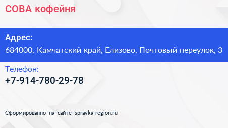 СОВА, кофейня по адресу 684000, Камчатский край, Елизово, Почтовый переулок, 3 в дальнейшем Организация, размещена в следующих категориях: