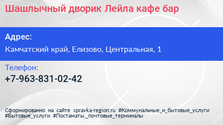 Шашлычный дворик Лейла, кафе-бар по адресу Камчатский край, Елизово, Центральная, 1 в дальнейшем Организация, размещена в следующих категориях: