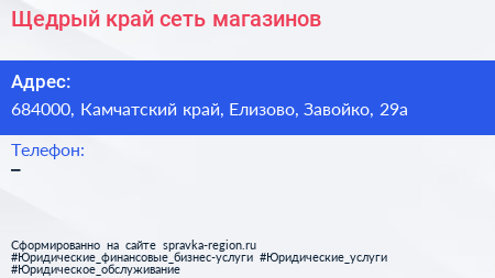 Щедрый край, сеть магазинов по адресу 684000, Камчатский край, Елизово, Завойко, 29а в дальнейшем Организация, размещена в следующих категориях: