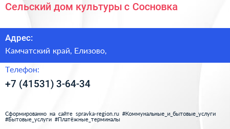 Сельский дом культуры, с. Сосновка по адресу Камчатский край, Елизово, в дальнейшем Организация, размещена в следующих категориях: