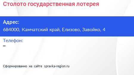 Столото, государственная лотерея по адресу 684000, Камчатский край, Елизово, Завойко, 4 в дальнейшем Организация, размещена в следующих категориях: