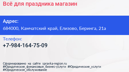 Всё для праздника, магазин по адресу 684000, Камчатский край, Елизово, Беринга, 21а в дальнейшем Организация, размещена в следующих категориях: