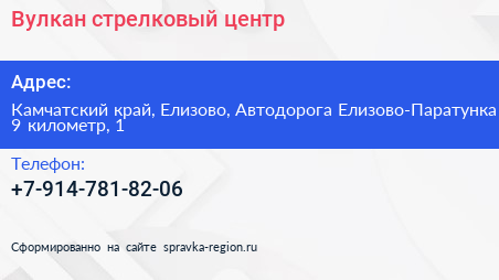 Вулкан, стрелковый центр по адресу Камчатский край, Елизово, Автодорога Елизово-Паратунка 9 километр, 1 в дальнейшем Организация, размещена в следующих категориях: