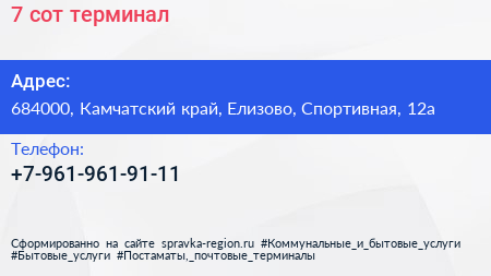 7 сот, терминал по адресу 684000, Камчатский край, Елизово, Спортивная, 12а в дальнейшем Организация, размещена в следующих категориях:
