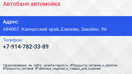 Автобаня, автомойка по адресу 684007, Камчатский край, Елизово, Завойко, 96 в дальнейшем Организация, размещена в следующих категориях: