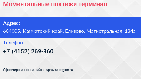 Моментальные платежи, терминал по адресу 684005, Камчатский край, Елизово, Магистральная, 134а в дальнейшем Организация, размещена в следующих категориях: