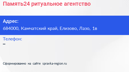 Память24, ритуальное агентство по адресу 684000, Камчатский край, Елизово, Лазо, 1в в дальнейшем Организация, размещена в следующих категориях: