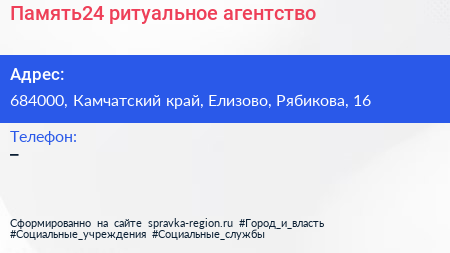 Память24, ритуальное агентство по адресу 684000, Камчатский край, Елизово, Рябикова, 16 в дальнейшем Организация, размещена в следующих категориях: