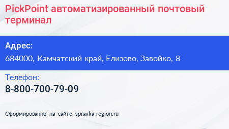 PickPoint, автоматизированный почтовый терминал по адресу 684000, Камчатский край, Елизово, Завойко, 8 в дальнейшем Организация, размещена в следующих категориях: