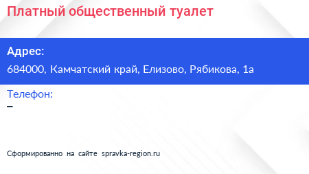 Платный общественный туалет по адресу 684000, Камчатский край, Елизово, Рябикова, 1а в дальнейшем Организация, размещена в следующих категориях: