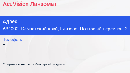 AcuVision, Линзомат по адресу 684000, Камчатский край, Елизово, Почтовый переулок, 3 в дальнейшем Организация, размещена в следующих категориях: