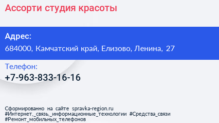 Ассорти, студия красоты по адресу 684000, Камчатский край, Елизово, Ленина, 27 в дальнейшем Организация, размещена в следующих категориях: