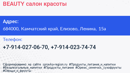 BEAUTY, салон красоты по адресу 684000, Камчатский край, Елизово, Ленина, 15а в дальнейшем Организация, размещена в следующих категориях: