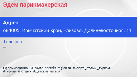Эдем, парикмахерская по адресу 684005, Камчатский край, Елизово, Дальневосточная, 11 в дальнейшем Организация, размещена в следующих категориях: