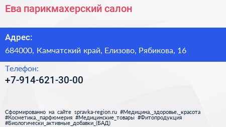 Ева, парикмахерский салон по адресу 684000, Камчатский край, Елизово, Рябикова, 16 в дальнейшем Организация, размещена в следующих категориях: