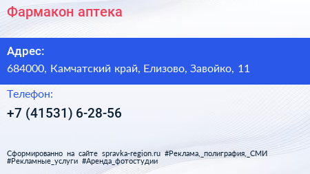 Для связи с организацией воспользуйтесь номером телефона: +7 (41531) 6-28-56. Ежедневно с 00:00 до 24:00. оптика: пн-пт 9:00-18:00, сб 10:00-17:00, вы можете обратиться в эту организацию.