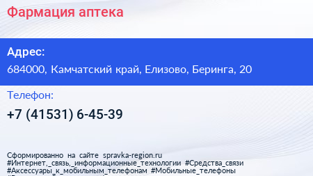 Фармация, аптека по адресу 684000, Камчатский край, Елизово, Беринга, 20 в дальнейшем Организация, размещена в следующих категориях: