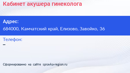 Кабинет акушера-гинеколога по адресу 684000, Камчатский край, Елизово, Завойко, 36 в дальнейшем Организация, размещена в следующих категориях: