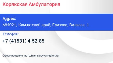 Корякская Амбулатория по адресу 684021, Камчатский край, Елизово, Вилкова, 1 в дальнейшем Организация, размещена в следующих категориях: