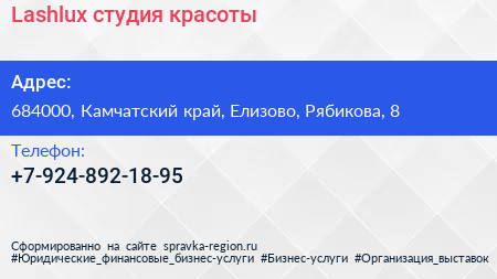 Lashlux, студия красоты по адресу 684000, Камчатский край, Елизово, Рябикова, 8 в дальнейшем Организация, размещена в следующих категориях: