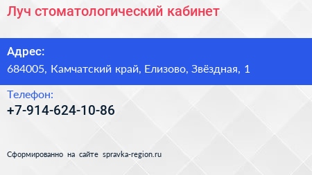 Луч, стоматологический кабинет по адресу 684005, Камчатский край, Елизово, Звёздная, 1 в дальнейшем Организация, размещена в следующих категориях: