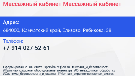 Массажный кабинет, Массажный кабинет по адресу 684000, Камчатский край, Елизово, Рябикова, 38 в дальнейшем Организация, размещена в следующих категориях: