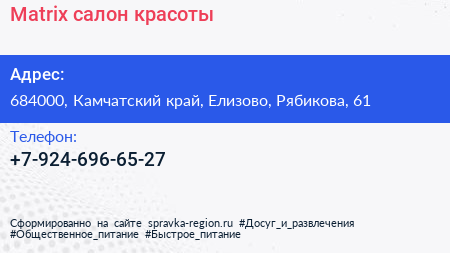 Matrix, салон красоты по адресу 684000, Камчатский край, Елизово, Рябикова, 61 в дальнейшем Организация, размещена в следующих категориях: