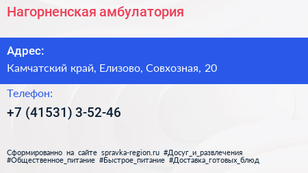 Нагорненская амбулатория по адресу Камчатский край, Елизово, Совхозная, 20 в дальнейшем Организация, размещена в следующих категориях: