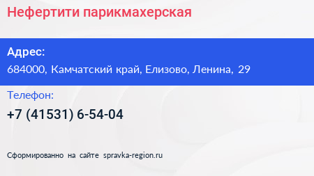 Нефертити, парикмахерская по адресу 684000, Камчатский край, Елизово, Ленина, 29 в дальнейшем Организация, размещена в следующих категориях: