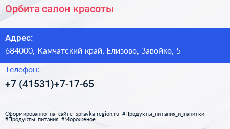 Орбита, салон красоты по адресу 684000, Камчатский край, Елизово, Завойко, 5 в дальнейшем Организация, размещена в следующих категориях: