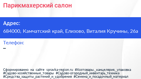 Парикмахерский салон по адресу 684000, Камчатский край, Елизово, Виталия Кручины, 26а в дальнейшем Организация, размещена в следующих категориях: