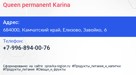 Queen permanent Karina по адресу 684000, Камчатский край, Елизово, Завойко, 6 в дальнейшем Организация, размещена в следующих категориях: