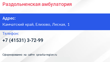 Раздольненская амбулатория по адресу Камчатский край, Елизово, Лесная, 1 в дальнейшем Организация, размещена в следующих категориях:
