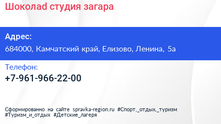 Шоколаd, студия загара по адресу 684000, Камчатский край, Елизово, Ленина, 5а в дальнейшем Организация, размещена в следующих категориях: