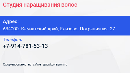 Студия наращивания волос по адресу 684000, Камчатский край, Елизово, Пограничная, 27 в дальнейшем Организация, размещена в следующих категориях: