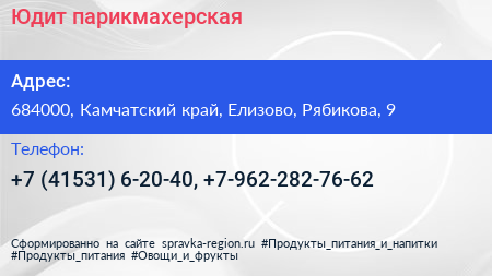 Юдит, парикмахерская по адресу 684000, Камчатский край, Елизово, Рябикова, 9 в дальнейшем Организация, размещена в следующих категориях: