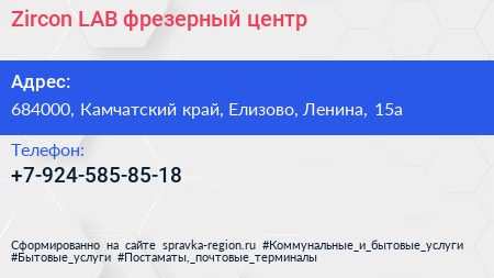 Zircon LAB, фрезерный центр по адресу 684000, Камчатский край, Елизово, Ленина, 15а в дальнейшем Организация, размещена в следующих категориях: