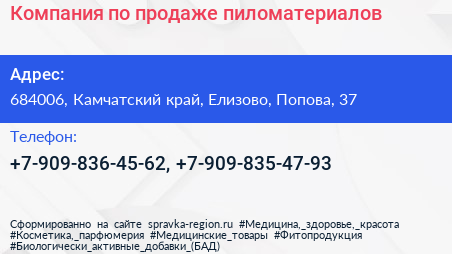 Компания по продаже пиломатериалов по адресу 684006, Камчатский край, Елизово, Попова, 37 в дальнейшем Организация, размещена в следующих категориях: